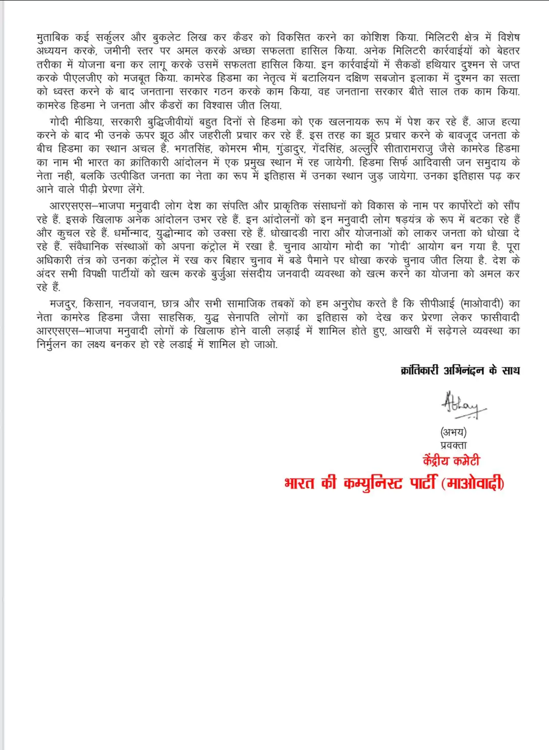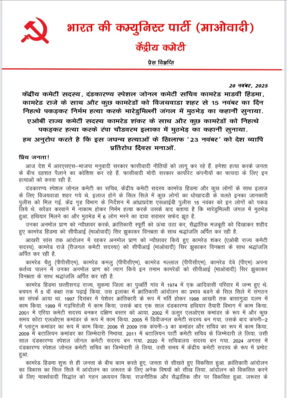 याचबरोबर, १९ नोव्हेंबरला सात जणांचा एन्काउंटरही झाल्याचा दावा खोटा असल्याचे नक्षल संघटनेने म्हटले आहे. या घटनांच्या निषेधार्थ २३ नोव्हेंबरला देशव्यापी निषेध दिन पाळण्याचे आवाहनही पत्रात नमूद करण्यात आले आहे. हिडमाला मुद्दाम “खलनायक” ठरवून खोटा प्रचार रचल्याचा आरोपही नोंदवण्यात आला आहे.