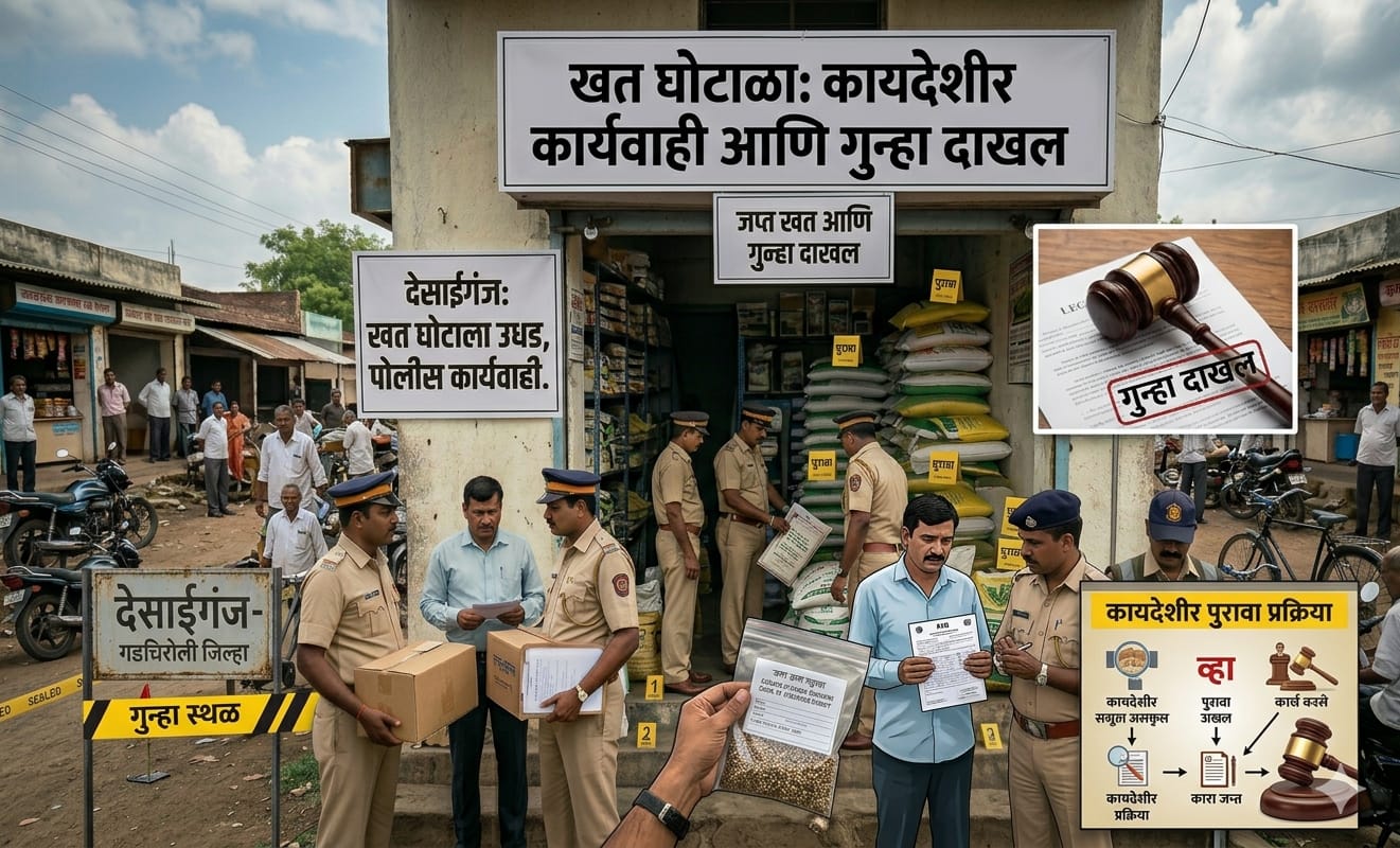 या अनियमिततेबाबत कृषी विभागाने ९ एप्रिल रोजी संबंधित संचालकास कारणे दाखवा नोटीस बजावली होती. मात्र त्यांचा खुलासा असमाधानकारक ठरल्याने तालुका कृषी अधिकारी कार्यालयाच्या खत निरीक्षक श्रीमती शितल खोबरागडे यांनी देसाईगंज पोलीस ठाण्यात फिर्याद दाखल केली. त्यानुसार अत्यावश्यक वस्तू अधिनियम, १९५५ तसेच खत (नियंत्रण) आदेश, १९८५ अंतर्गत गुन्हा नोंदवण्यात आला आहे.
