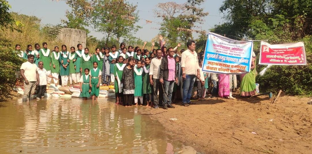 ता. प्र / धानोरा, दि. २१ : गडचिरोली तालुक्यातील मौशिखांब ग्राम पंचायत वतीने मुख्यमंत्री समृद्ध पंचायत राज अभियान अंतर्गत राबविण्यात आलेल्या महाश्रमदानातून रानखेडा येथील नाल्यावर वनराई बंधाऱ्याचे बांधकाम करण्यात आले. 20 नोव्हेंबर 2025 रोजी ग्रामस्थ, विद्यार्थी, शिक्षकवर्ग आणि पंचायत पदाधिकाऱ्यांनी एकत्रितपणे 270 सिमेंट खाली बॅगांचा वापर करून हा बंधारा उभारला.