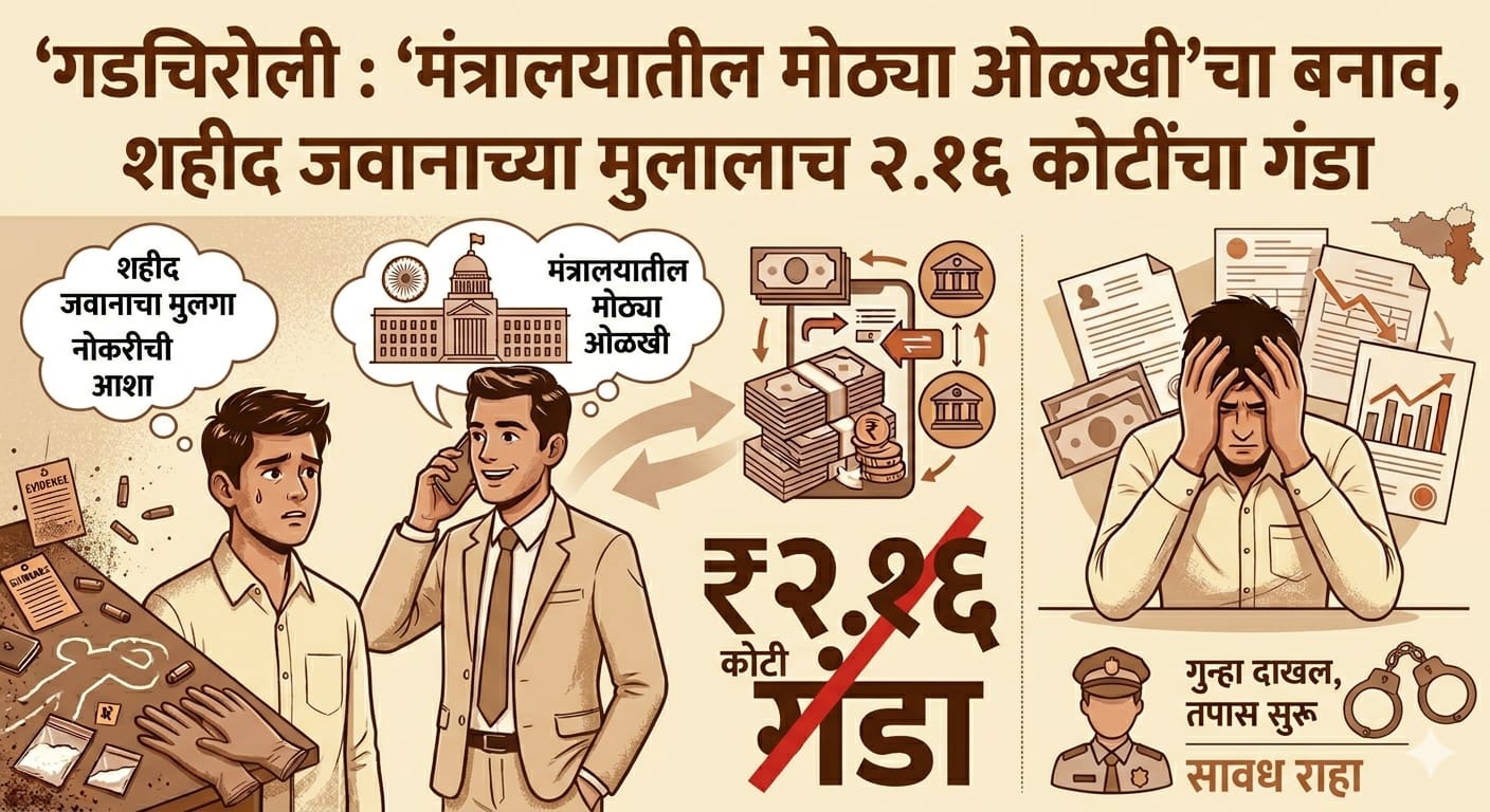 गडचिरोली, दि. २२ : नक्षलवाद्यांच्या हल्ल्यात शहीद झालेल्या जवानाच्या मुलालाच लक्ष्य करून ‘मंत्रालयात थेट ओळख आहे’ असा बनाव रचत तब्बल २ कोटी १६ लाख ७९ हजार १०० रुपयांची फसवणूक केल्याचा धक्कादायक प्रकार उघडकीस आला आहे. दोन वर्षांहून अधिक काळ नियोजनबद्ध पद्धतीने ही फसवणूक सुरू होती. याप्रकरणी गडचिरोली पोलिसांनी गुन्हा दाखल करून मुख्य सूत्रधार ज्ञानेश्वर शिवाजी वारे यास अटक केली असून तपास अधिक गतीने सुरू आहे.