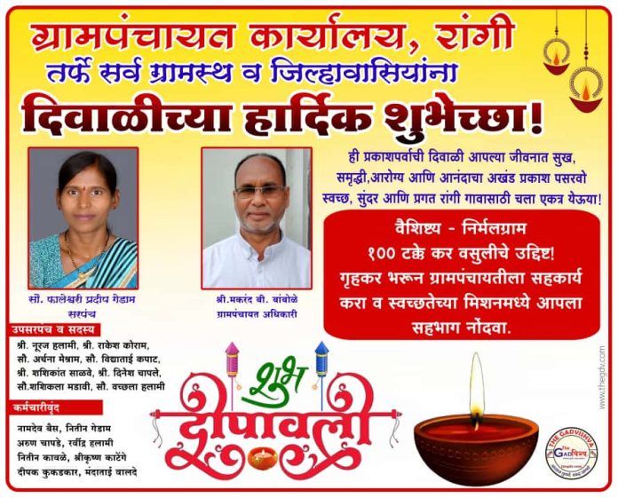 ग्रामपंचायत कार्यालय, रांगी तर्फे सर्व ग्रामस्थ व जिल्हावासियांना दिवाळीच्या हार्दिक व मंगलमय शुभेच्छा…! ही दीपावली आपल्या आयुष्यात आनंद, आरोग्य, समृद्धी आणि सौहार्द घेऊन येवो, प्रत्येक घरात सुख-शांतीचा प्रकाश नांदो हीच सदिच्छा!