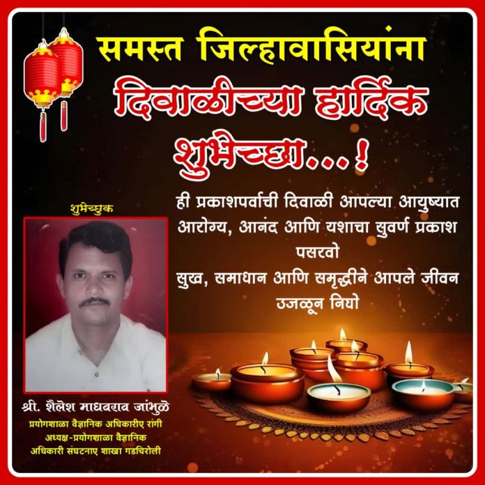 गडचिरोलीविदर्भ समस्त जिल्हावासियांना दिवाळीच्या हार्दिक शुभेच्छा…! By The Gadvishva - October 20, 2025 15 Share FacebookTwitterWhatsAppTelegram समस्त जिल्हावासियांना दिवाळीच्या हार्दिक शुभेच्छा…! ही प्रकाशपर्वाची दिवाळी आपल्या आयुष्यात आरोग्य, आनंद आणि यशाचा सुवर्ण प्रकाश पसरवो सुख, समाधान आणि समृद्धीने आपले जीवन उजळून निघो शुभेच्छुक : श्री. शैलेश माधवराव जांभळे प्रयोगशाळा वैज्ञानिक अधिकारी, रांगी अध्यक्ष – प्रयोगशाळा वैज्ञानिक अधिकारी संघटना, शाखा गडचिरोली