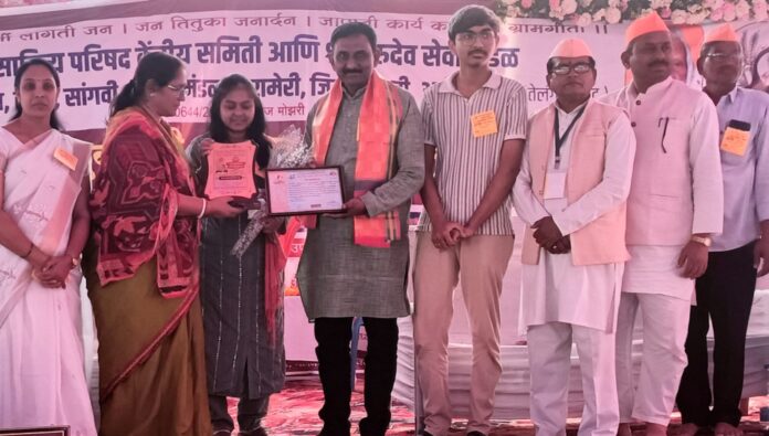 गडचिरोली, दि. १० : निष्ठावान पत्रकारिता, समाजप्रबोधन आणि राष्ट्रसंत तुकडोजी महाराज यांच्या विचारांचा सातत्याने प्रभावी प्रचार-प्रसार केल्याबद्दल गडचिरोली येथील पत्रकार उदय बळीरामजी धकाते यांना तेलंगणा राज्यातील गोयेगाव (मंडल-केरामेरी, जि. आसिफाबाद) येथे आयोजित समारंभात ‘श्रीगुरुदेव पत्रकारिता पुरस्कार’ प्रदान करून सन्मानित करण्यात आले.