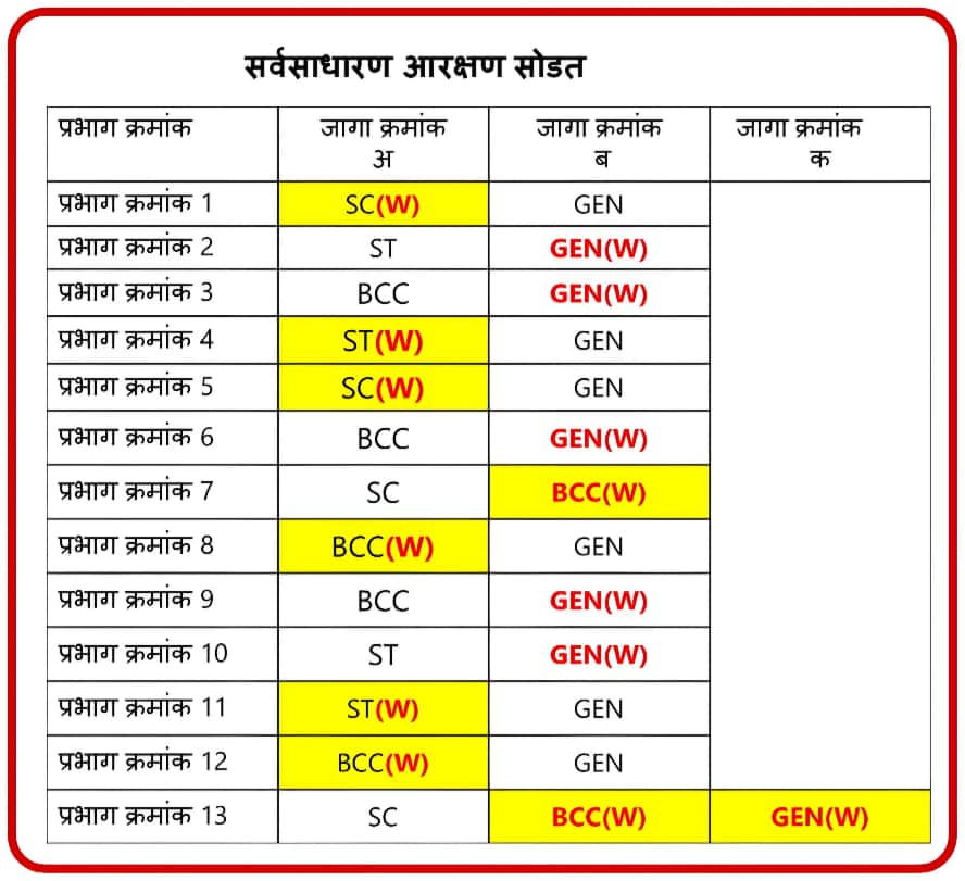प्रभागनिहाय आरक्षण खालीलप्रमाणे निश्चित: