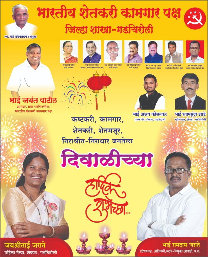 गडचिरोलीविदर्भ कष्टकरी, कामगार, शेतकरी, शेतमजूर, निराश्रीत-निराधार जनतेला दिवाळीच्या हार्दिक शुभेच्छा…! By The Gadvishva - October 20, 2025 16 Share FacebookTwitterWhatsAppTelegram कष्टकरी, कामगार, शेतकरी, शेतमजूर, निराश्रीत-निराधार जनतेला दिवाळीच्या हार्दिक शुभेच्छा…! शुभेच्छुक : भारतीय शेतकरी कामगार पक्ष, जिल्हा शाखा-गडचिरोली